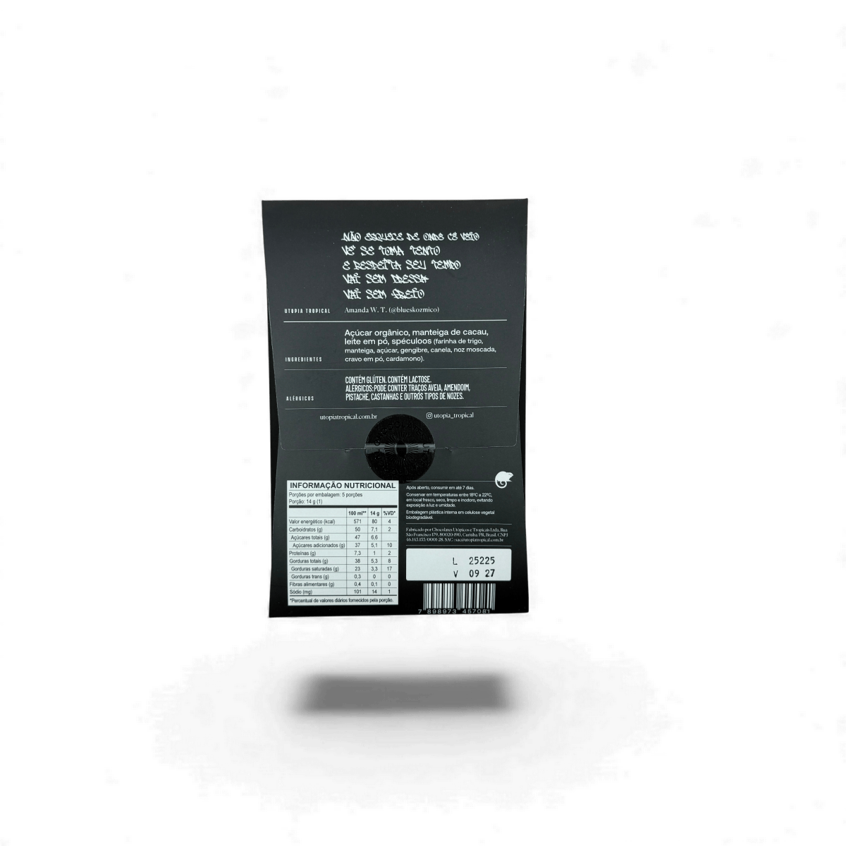 Beurre de cacao, sucre biologique, beurre de cacao, lait en poudre caramélisé, spéculoos.