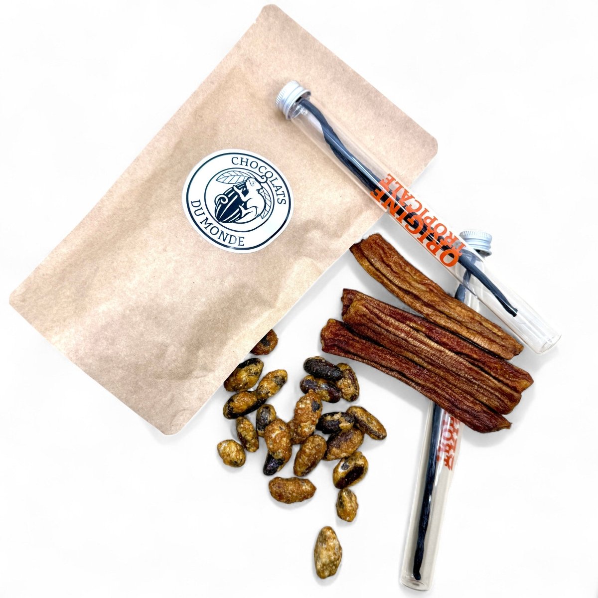Pour prolonger cet été tropical, nous vous proposons un coffret qui résiste aux fortes chaleurs. Sans chocolat, mais riche en arômes cacaotés, il met à l’honneur nos fèves caramélisées, ainsi qu’une infusion froide au cacao et à la vanille. Le tout provient directement de notre ferme à Saõ et notre coopération partenaire en Équateur.