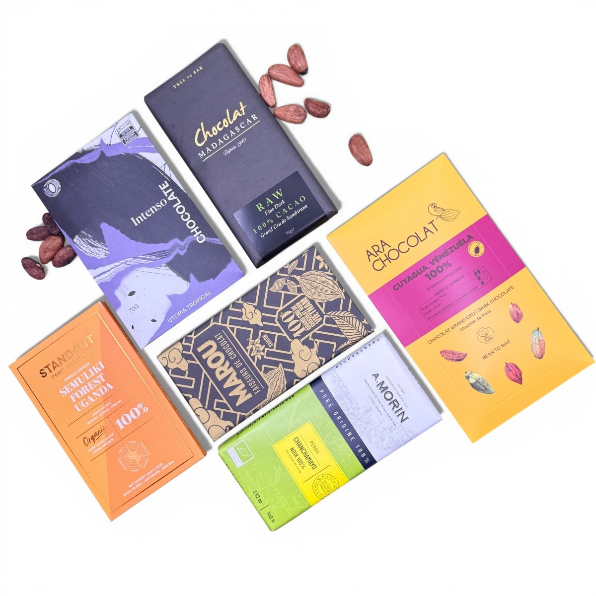 Plongez au cœur de l’authenticité avec notre coffret 100 % cacao, une sélection unique de tablettes d’exception issues de terroirs emblématiques du chocolat bean-to-bar. Chaque chocolat est élaboré sans ajout de sucre, révélant la richesse aromatique intrinsèque des fèves et l’expression la plus pure du cacao.